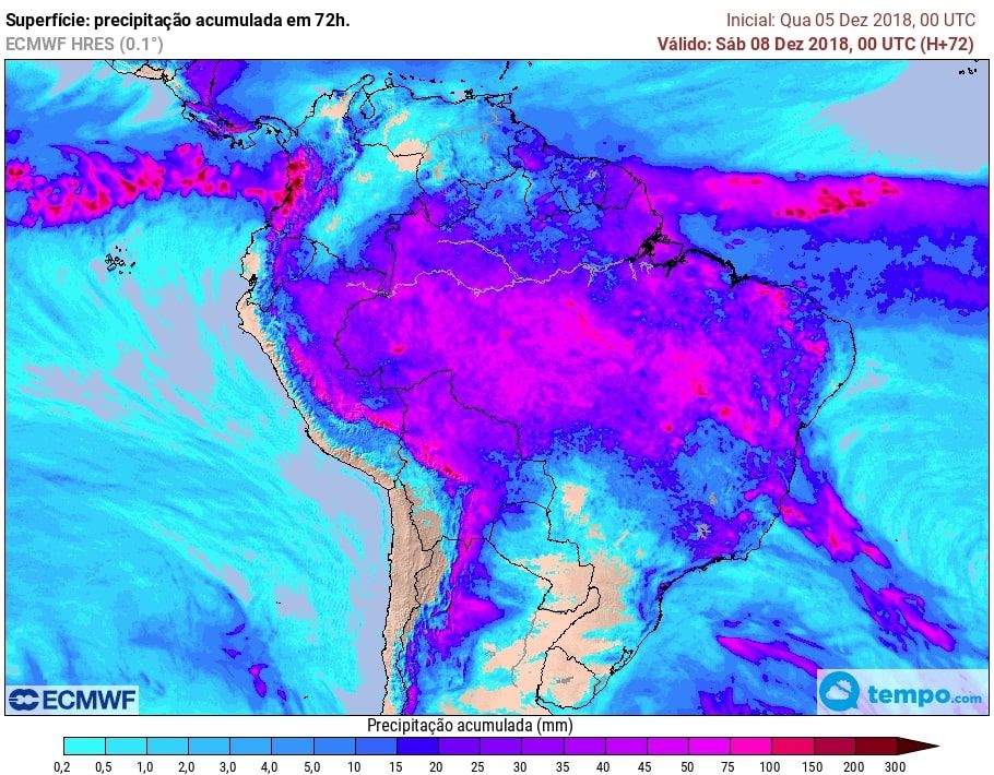 Nesta quarta-feira (05) chuvas já pela manhã ocorreram no norte do Mato Grosso, de Goiás e de Minas Gerais. No entanto, as chuvas mais intensas e volumosas vem ocorrendo na Bahia, Tocantins, Pará e no sul do Piauí e do Maranhão, com volumes até o momento de até 65mm. Na parte da tarde, as chuvas se tornam mais abrangentes e menos intensas, porém passam a ocorrer na metade norte do Mato Grosso e de Minas Gerais.
