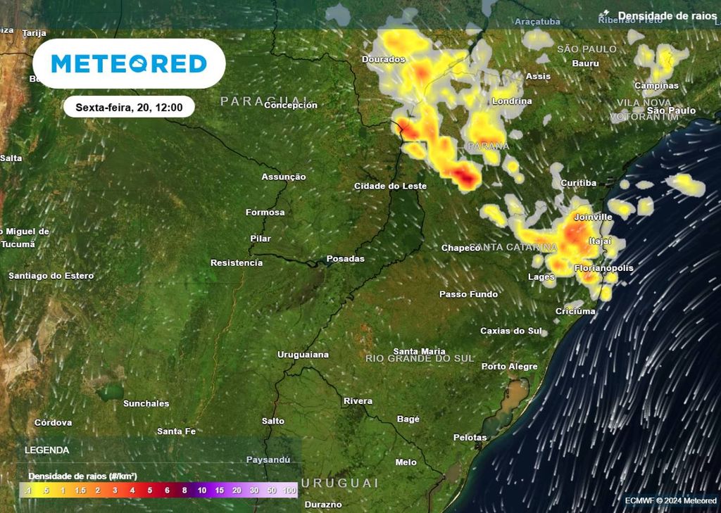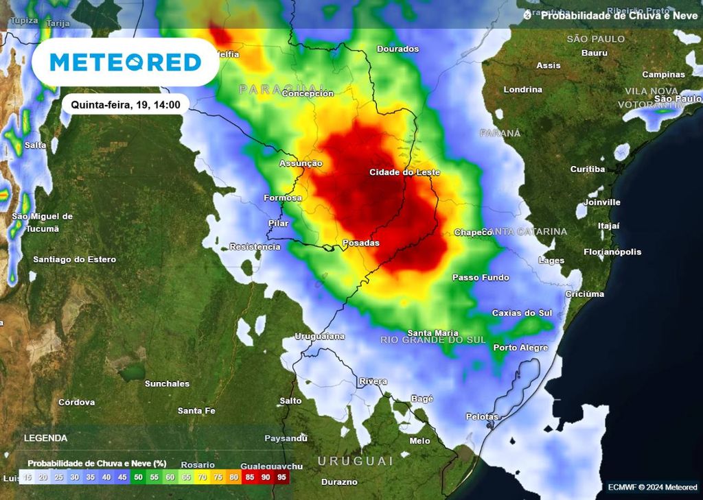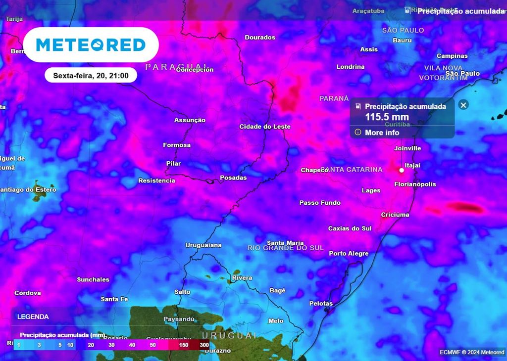 Até a noite (21h) de sexta-feira (20), os maiores acumulados de precipitação (em mm) são esperados no oeste do Paraná e no Vale do Itajaí em Santa Catarina, onde podem passar dos 100 mm. Nas demais regiões desses dois estados, os totais variam entre 10 mm e 90 mm. Na metade sul do Rio Grande do Sul, os totais não ultrapassam os 20 mm, e nas demais regiões gaúchas variam entre 20 mm e 55 mm.