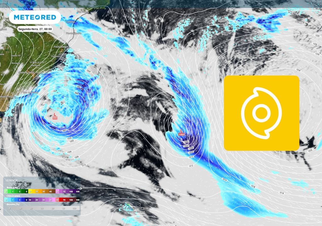 Mas além disso, um segundo ciclone, muito mais intenso, se formará na altura da Argentina entre o sábado (25) e o domingo (26), impulsionando uma frente fria intensa em direção ao Brasil que não só intensifica as chuvas, como também traz outros efeitos para o país.