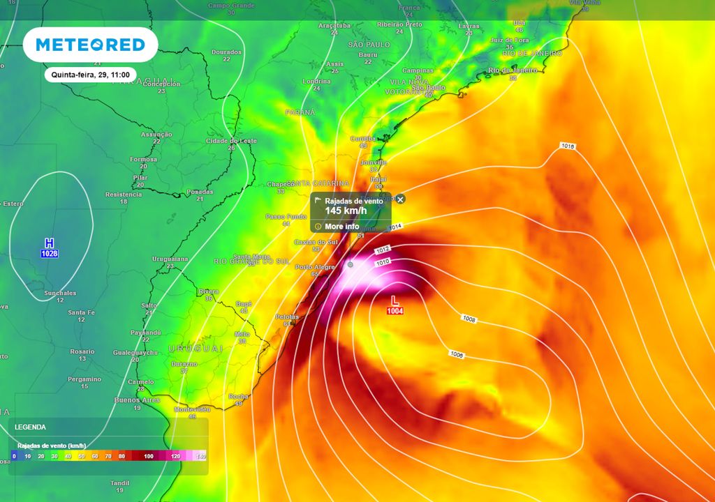 Na noite de quarta-feira (28), os ventos já estarão excedendo os 100 km/h no litoral gaúcho e em municípios como Mostardas e Capão da Canoa. No oceano, as rajadas de vento podem chegar a velocidades de até 150 km/h, com um pico de intensidade por volta do meio-dia de quinta-feira (29).