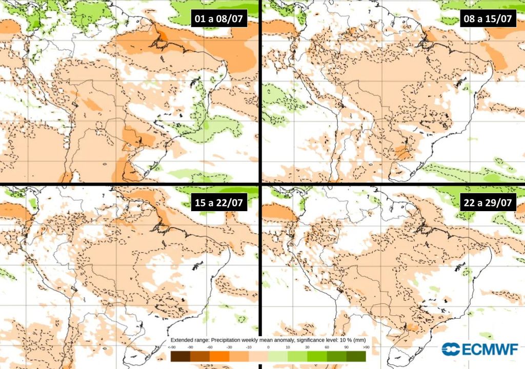 Devido a atuação dessa frente fria, o modelo ECMWF prevê uma anomalia positiva de precipitação na primeira semana de Julho na porção leste da região Sudeste, incluindo partes do estado da Bahia, o que indica que essa frente poderá alcançar latitudes mais a norte. Enquanto que o norte da região Sul, grande parte das regiões Centro-Oeste e Norte, além do norte do Nordeste registrarão acumulados de chuva abaixo da média.