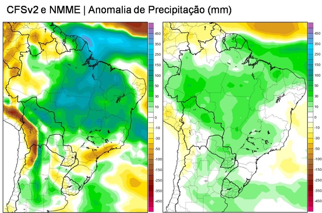 Os modelos CFSv2 e NMME mostram anomalias positivas de chuva maiores para a metade norte do país. Isso pode ser justificado pelo que foi dito anteriormente, que a primeira quinzena será chuvosa nessas áreas, com contribuição para a TSM mais aquecida na região costeira do estado do Espírito Santo e do sul da Bahia, que acabam favorecendo o estabelecimento de sistemas frontais e, consequentemente, a convergência de umidade nas áreas mais ao norte.