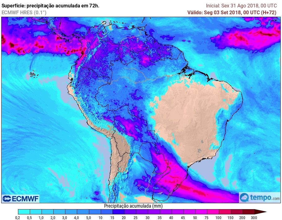 Mudança no tempo no sul do Mato Grosso, com aumento da nebulosidade e chuva ocorrendo a partir da tarde de forma isolada. Já em São Paulo a chuva chega ao oeste no fim da tarde e, durante a noite passa a ocorrer no centro, sul e leste do estado.