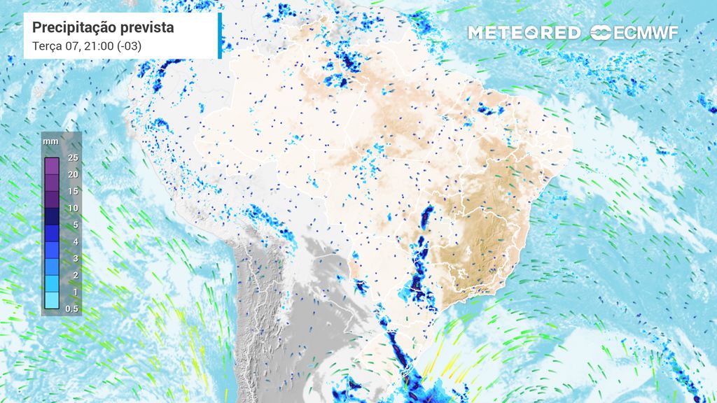 Na madrugada da segunda-feira (6), instabilidades podem provocar chuvas pontuais entre o Oeste e a Campanha no Rio Grande do Sul. Ao mesmo tempo, a circulação dos ventos de leste, promovido pela atuação de uma massa de ar frio, provoca chuvas na faixa leste do norte do Rio Grande do Sul até o Paraná, com chuvas de até forte intensidade na região de Florianópolis, em Santa Catarina.
