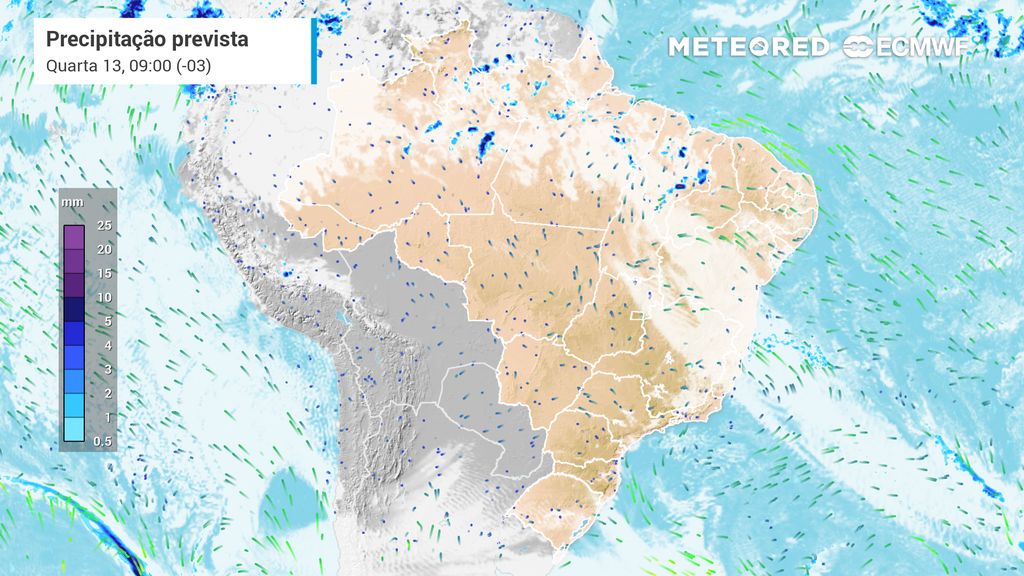 A partir de quinta-feira (14), uma frente fria passa no oceano sem afetar o Brasil, mas a massa de ar polar que vem depois vai influenciar o centro-sul do país e, consequentemente, o leste da Região Sul, o leste de São Paulo e o Rio de Janeiro, através do ar frio e favorecendo o transporte de umidade do oceano em direção à costa.