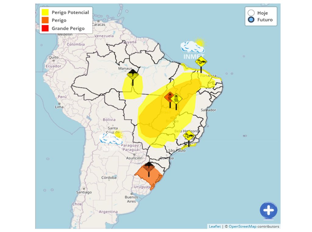 Segundo o Instituto Nacional de Meteorologia (INMET), para este domingo (5), 10 estados estão sob condições de “perigo potencial” (aviso amarelo) e 7 sob “perigo” (aviso laranja), levando em consideração que há estados que possuem os dois tipos de avisos: