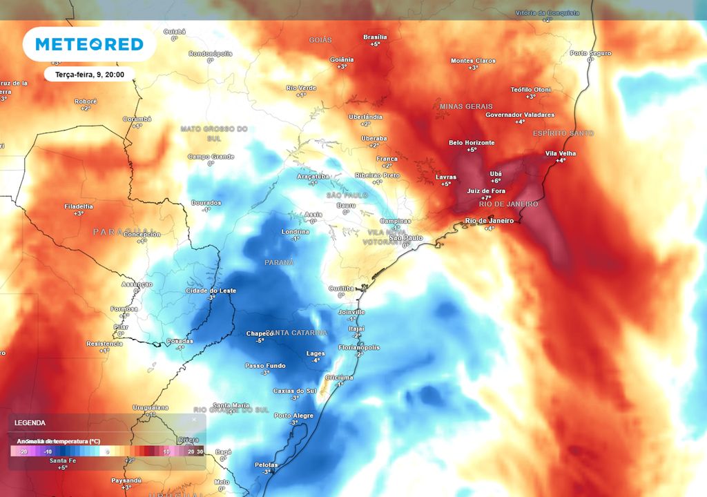 Neste momento, uma massa de ar frio está avançando pela região Sul, após a passagem de uma frente fria que está causando chuvas expressivas. Esse sistema está causando uma queda das temperaturas na região Sul e, ao longo da terça-feira (9), atuará também no Mato Grosso do Sul, sul de Goiás, São Paulo e Rio de Janeiro.