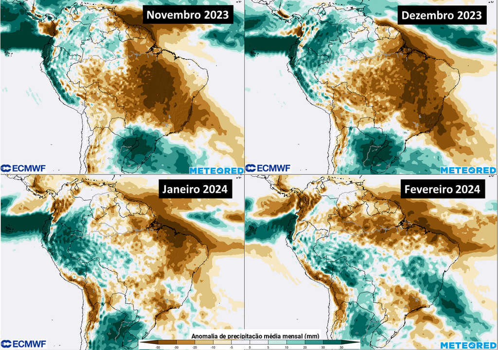 Essa mudança no padrão de anomalias de chuva fica ainda mais evidente em janeiro de 2024, quando o modelo projeta chuvas acima da média em boa parte da porção oeste e sudoeste do Norte, chuvas abaixo da média concentradas sobre o Nordeste e uma redução das anomalias positivas no Sul, ficando mais restritas ao oeste do Rio Grande do Sul. Além disso, a previsão para fevereiro se destaca por reduzir os acumulados na região Sul e por colocar chuvas acima da média entre as regiões Sudeste e Nordeste, numa região característica da Zona de Convergência do Atlântico Sul (ZCAS).