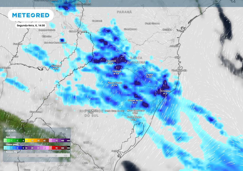 Neste momento, uma frente fria está avançando pela região Sul e causando chuvas fortes na região ao longo da semana. Além disso, o sistema também ocasionará chuvas sobre parte do Sudeste e do Centro-Oeste do Brasil.