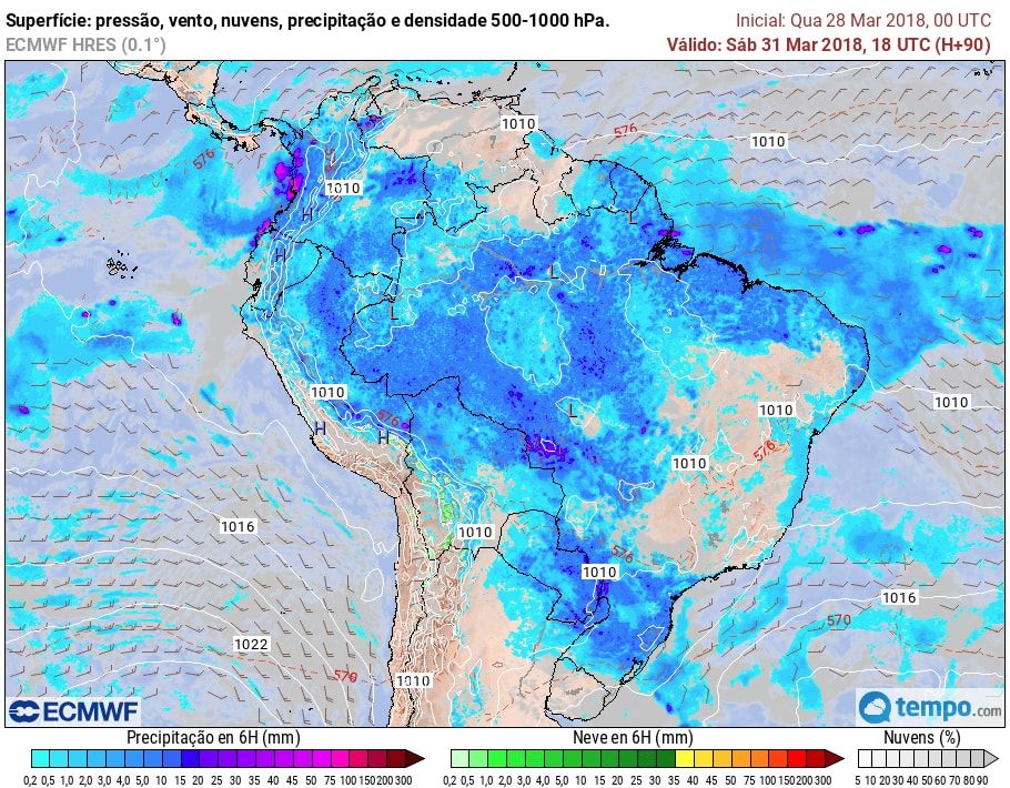 Nos estado do MS e de SP o sol aparece entre muitas nuvens pela manhã e no fim do período há chance de ocorrerem as primeiras chuvas do dia. A partir da tarde as instabilidades ganham força e se espalham levando chuva para todo o MS, SP, leste de GO e Triângulo Mineiro. No Restante do país as chuvas se mantêm no norte do Nordeste e, nas áreas mais ao leste ocorrem somente entre Recife e Natal.