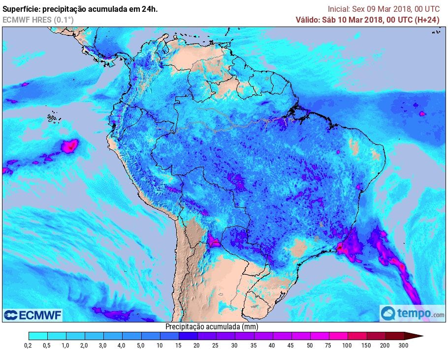 No sábado (10) o dia começa com bastante nebulosidade e chuva no Centro-Oeste, Norte, Sudeste, oeste do Nordeste e parte da Região Sul. Os estados de São Paulo, Paraná e Santa Catarina, chove de maneira fraca e bastante pontual, o que permite o aparecimento do sol. Já no litoral desses estados a concentração de nuvens é mais elevada, com chuva fraca a moderada pela manhã e redução a partir da tarde.