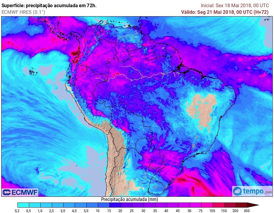 No domingo (20) a frente fria avança de forma mais costeira pelo Sudeste, chegando, durante a madrugada, no ES e, no restante do dia, até o Sul da BA, provocando mais frio do que chuva. Com o estabelecimento da massa de ar polar, o tempo fica mais firme, porém ao longo do dia, o céu fica nublado no RS até o PR e, na faixa que vai desde o RJ e ES até RO, passando por MG, GO e metade norte do MT.