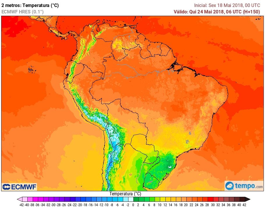 As temperaturas diminuem bastante, com mínimas abaixo dos 5°C na serra gaúcha e na catarinense podem atingir valores próximos de 0°C. Mesmo com a previsão de muita nebulosidade e ocorrência de chuva fraca nas áreas mais altas, não há previsão para ocorrência de neve. No Sudeste e no estado do MS, as temperaturas ficam abaixo dos 10°C.