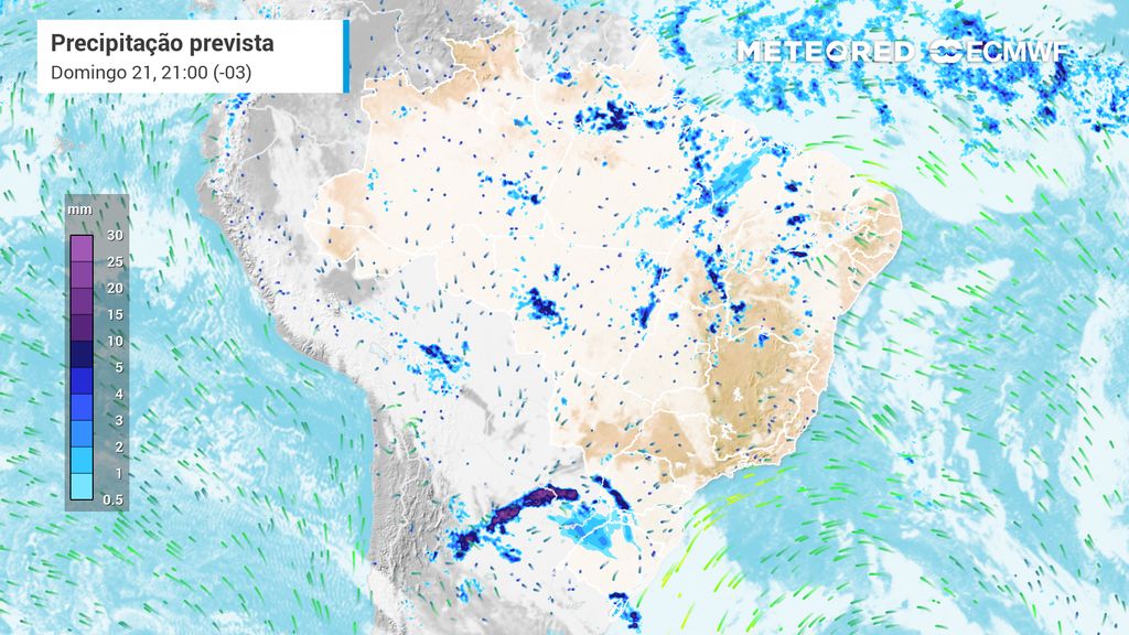 O amanhecer de domingo (21) será marcado por chuvas isoladas no Centro-Oeste e no Nordeste. Até o fim da manhã, são esperadas chuvas leves a moderadas entre o Mato Grosso do Sul e o norte do Maranhão, além do retorno das pancadas no leste da Bahia, algumas com forte intensidade.