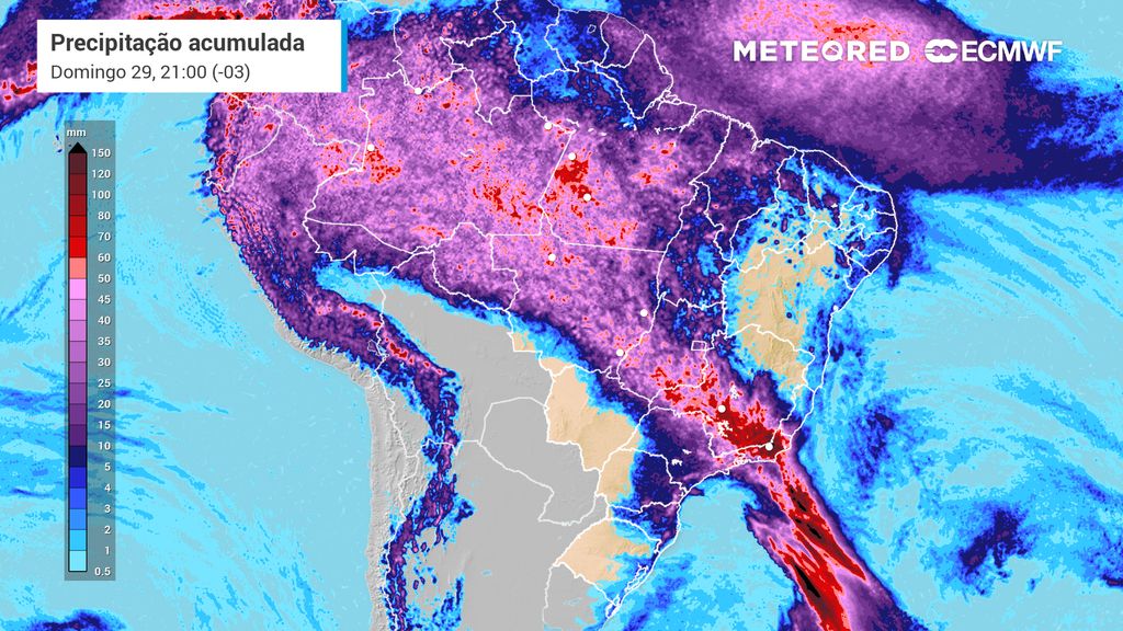 No domingo (29), há chuvas pontuais pela manhã em toda a porção de atuação da ZCAS, mas com chuvas mais abrangentes de fraca a moderada intensidade ainda sobre o leste do Sudeste, no sul mineiro, na Zona da Mata e no Rio de Janeiro.