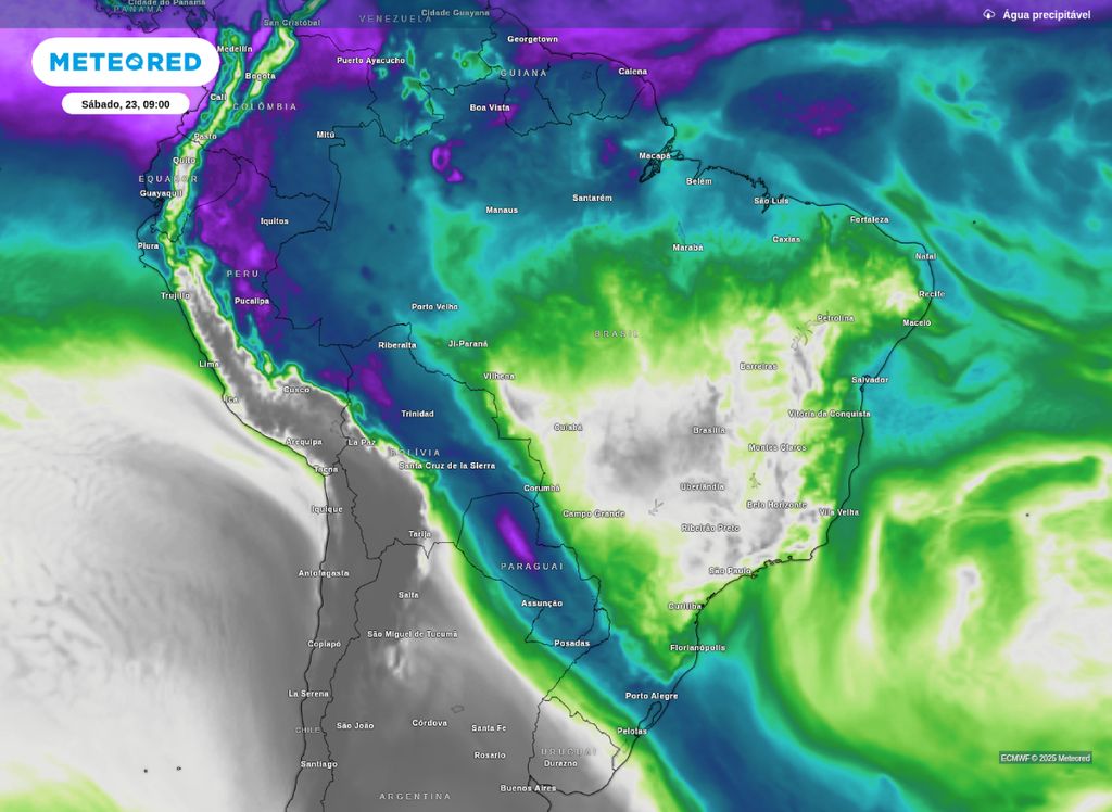 No sábado (23), há o avanço da frente fria sobre o Rio Grande do Sul e leva consigo as chuvas. A intensidade varia com momentos de chuva fraca e de moderada/forte.