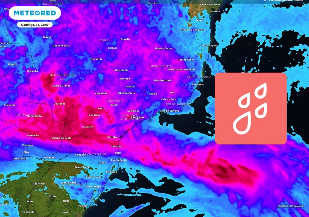 A primeira metade do domingo (14) será com tempo totalmente fechado e com chuvas moderadas a fortes em grande parte do Paraná, São Paulo e sul de Minas Gerais. No Centro-Oeste, o corredor úmido provoca chuvas sobre o Mato Grosso e pontos isolados de Goiás.