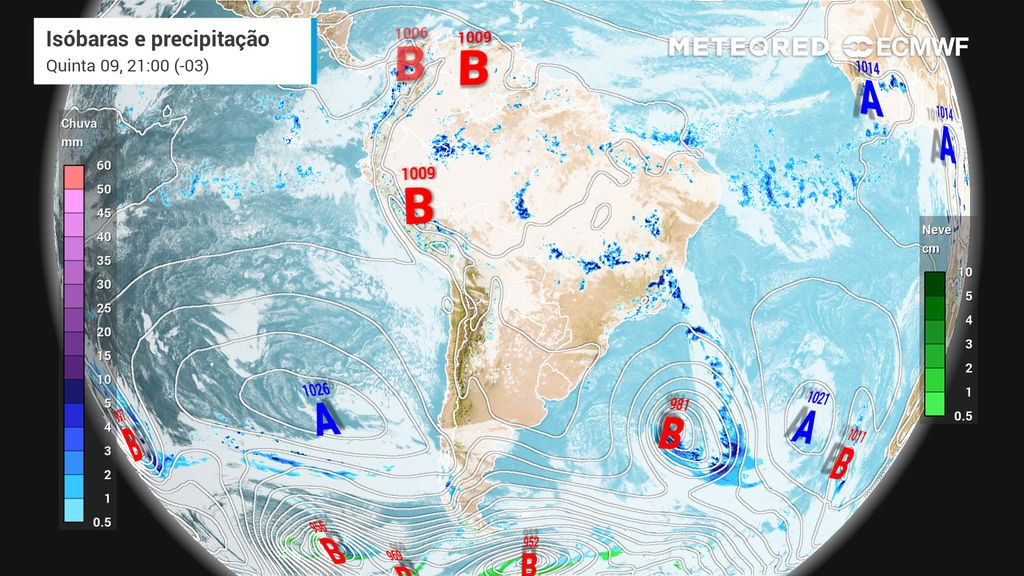Na quinta-feira (9), com o deslocamento da frente fria mais para o norte, o sistema estará próximo à costa do Rio de Janeiro e, por isso, passa a afetar o tempo mais no estado carioca, em Minas Gerais e no Espírito Santo.