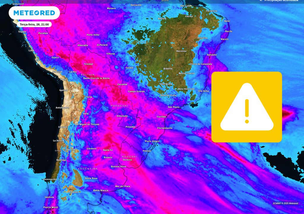 O acumulado de chuva entre sexta-feira (24) e terça-feira (28) pode ultrapassar 100 mm no sul do Mato Grosso do Sul. No interior do Paraná, os volumes ficam entre 60 e 80 mm, e no interior catarinense, cerca de 40 mm em 96 horas.