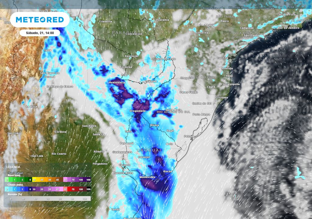 Neste sábado (21), uma frente fria começará a avançar pela região Sul. Já no próprio sábado durante a tarde, o sistema começará a ocasionar chuvas no Rio Grande do Sul (especialmente no sudoeste do estado), como é possível observar no vídeo acima.