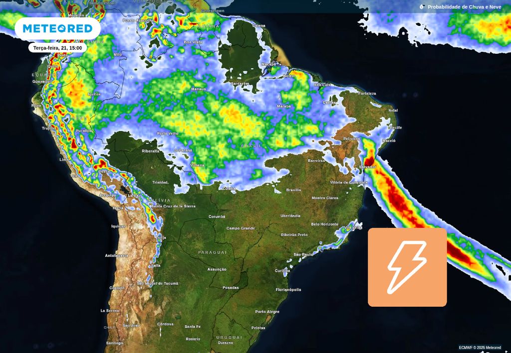 Em áreas pontuais do Maranhão e do Piauí, os modelos de previsão indicam chuvas com intensidade entre moderada e forte, que podem vir acompanhadas de trovoadas e descargas elétricas.