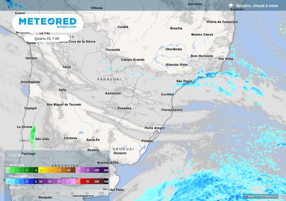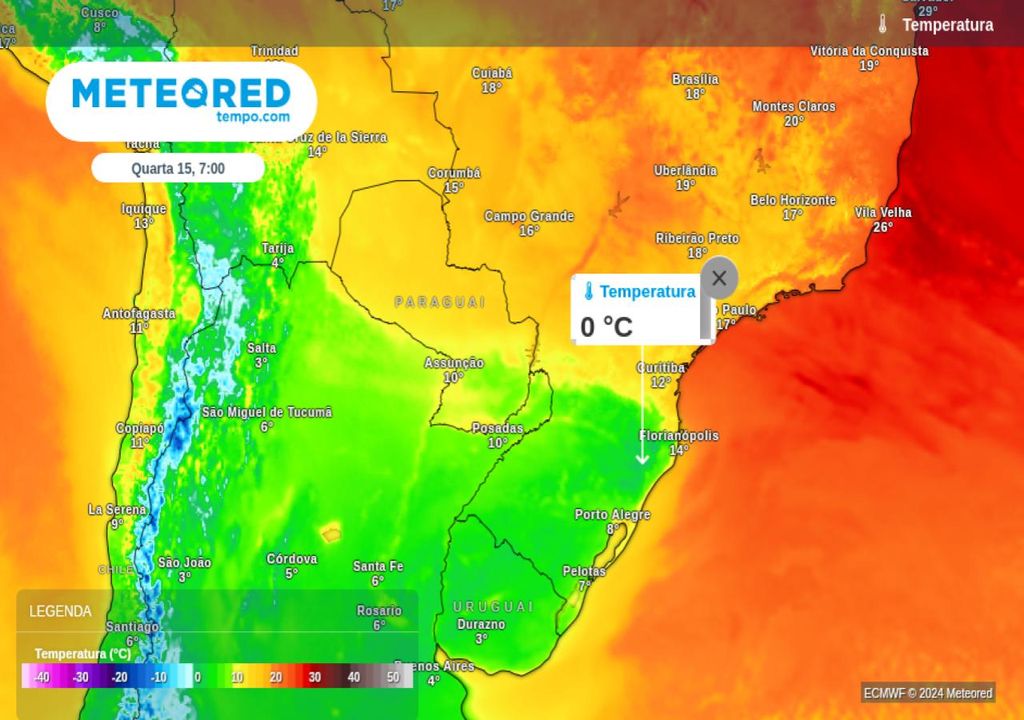 Ainda na terça-feira, essa massa de ar frio também derrubará as temperaturas no estado de Santa Catarina e Paraná, este último com menor intensidade. Na quarta-feira (15) o frio se intensificará ainda mais e as temperaturas mínimas podem ficar abaixo dos 10ºC em quase todo o Rio Grande do Sul e grande parte de Santa Catarina. A serra gaúcha poderá amanhecer com temperaturas próximas dos 0º!