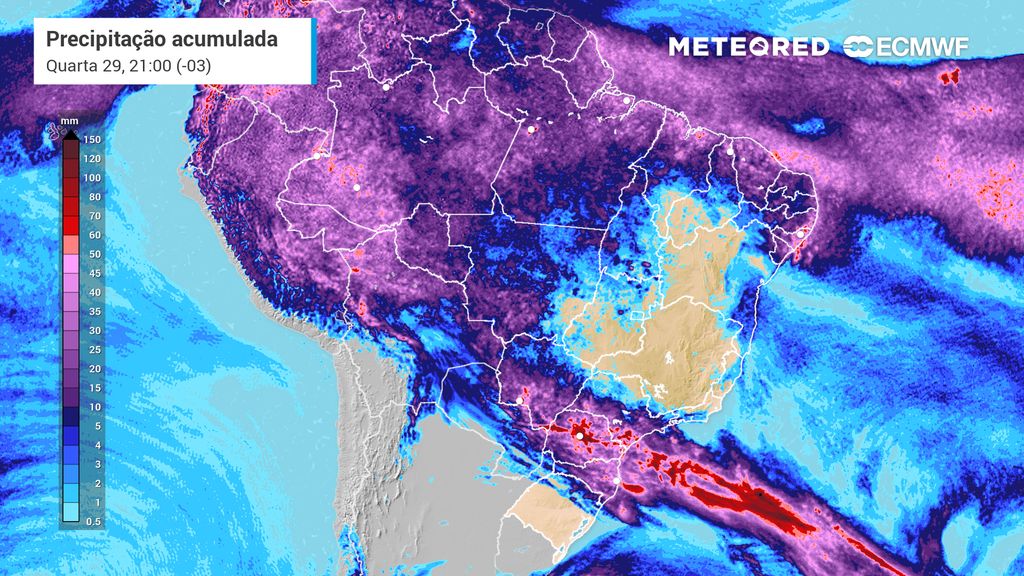 Contudo, áreas pontuais do centro-sul do Mato Grosso do Sul e do sul de São Paulo podem registrar valores em torno dos 100 mm. Mas o destaque fica para o Paraná, onde os volumes passam dos 100 mm em localidades do oeste e do centro do estado, por exemplo, em Ivaiporã (130 mm), Perobal (112 mm) e Reserva (128 mm).