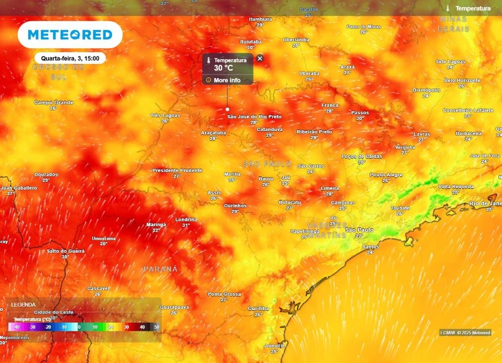 As temperaturas nesta quarta-feira (3) ficam mais amenas ainda, não passando dos 30°C no estado de São Paulo. No norte, no noroeste, e em algumas localidades do centro e da região de Presidente Prudente, as máximas variam entre 28°C e 30°C.