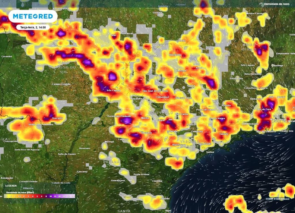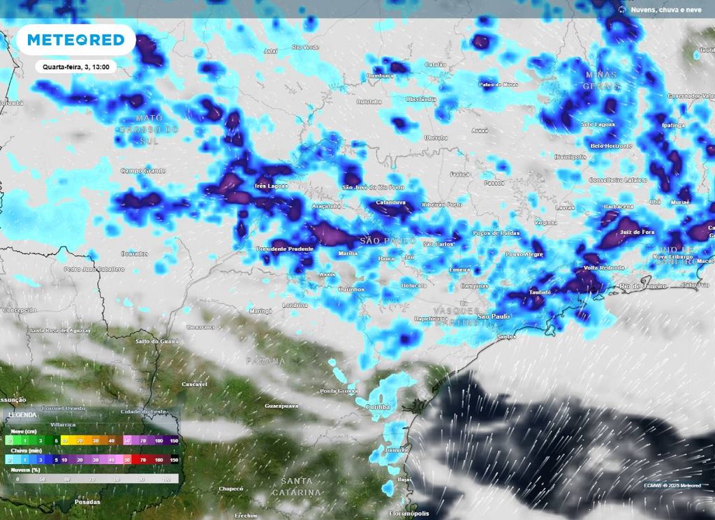 Na quarta-feira (3) de manhã, com o centro de baixa pressão atmosférica já formado sobre o oceano Atlântico, a nebulosidade aumenta sobre São Paulo, provocando áreas de chuvas mais localizadas, eventualmente intensas e acompanhadas por trovoadas no leste e sul do estado.