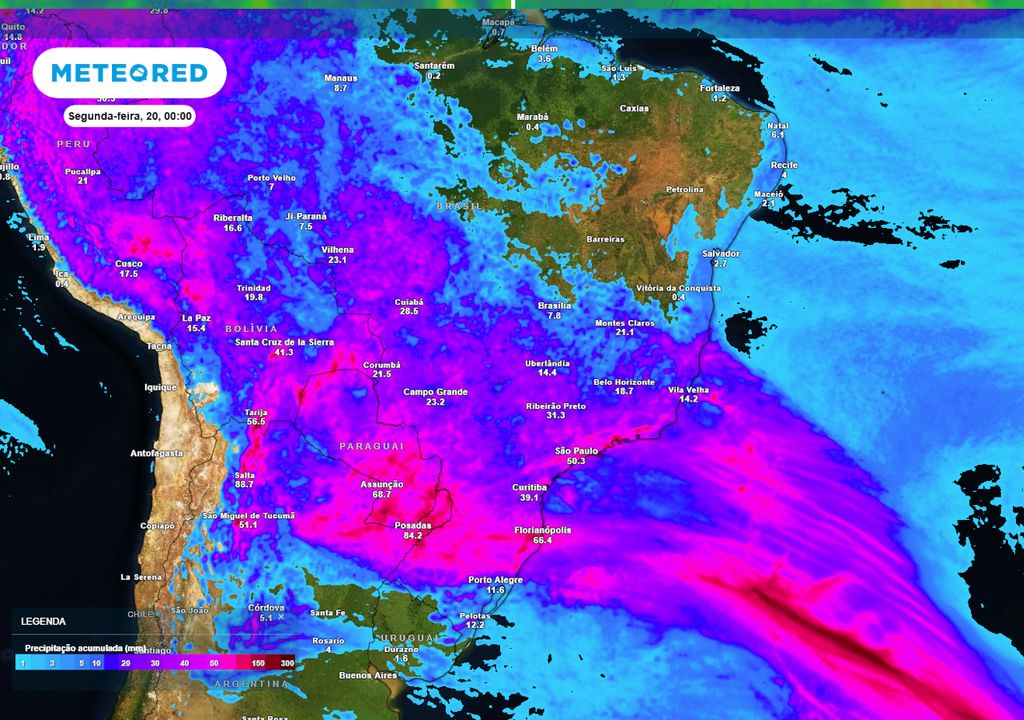 Durante o domingo (19), chuvas fortes ainda podem se formar em todo o leste de São Paulo (incluindo a região metropolitana da capital), em todo o Rio de Janeiro e também em todo o Espírito Santo - o que significa que o sistema pode causar grandes transtornos em todas as capitais do Sudeste ao longo de todo o final de semana.