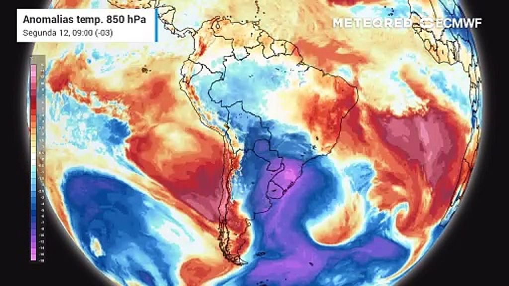 Ao que tudo indica, foi um dos poucos e último frio do inverno deste ano. Mas o evento ainda não acabou, tem mais frio nesses próximos dias. A anomalia de temperatura em 850 hPa mostra a presença da massa de ar polar sobre as áreas em azul do mapa.