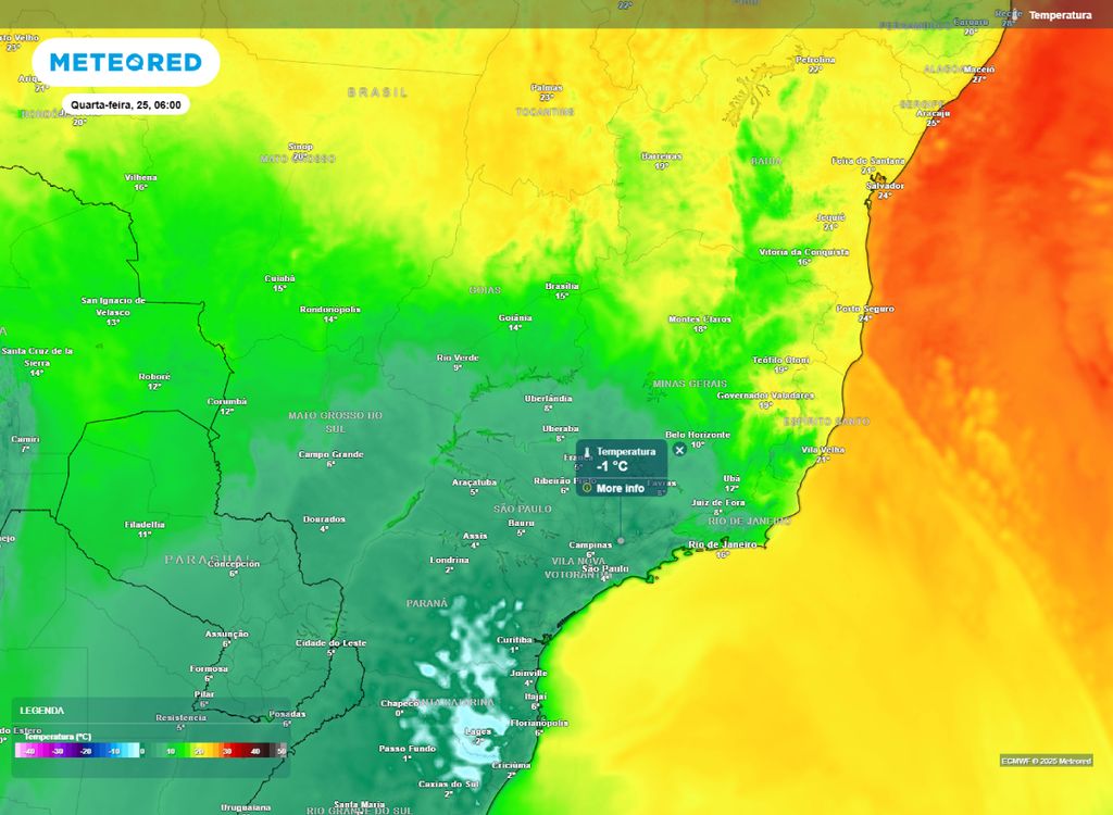 Na quarta-feira (25) o frio extremo ganha força sobre uma ampla área da região Sudeste. Exceto pelo litoral, todo o estado de São Paulo registrará temperaturas abaixo de 10°C, com mínimas essencialmente abaixo dos 7°C.