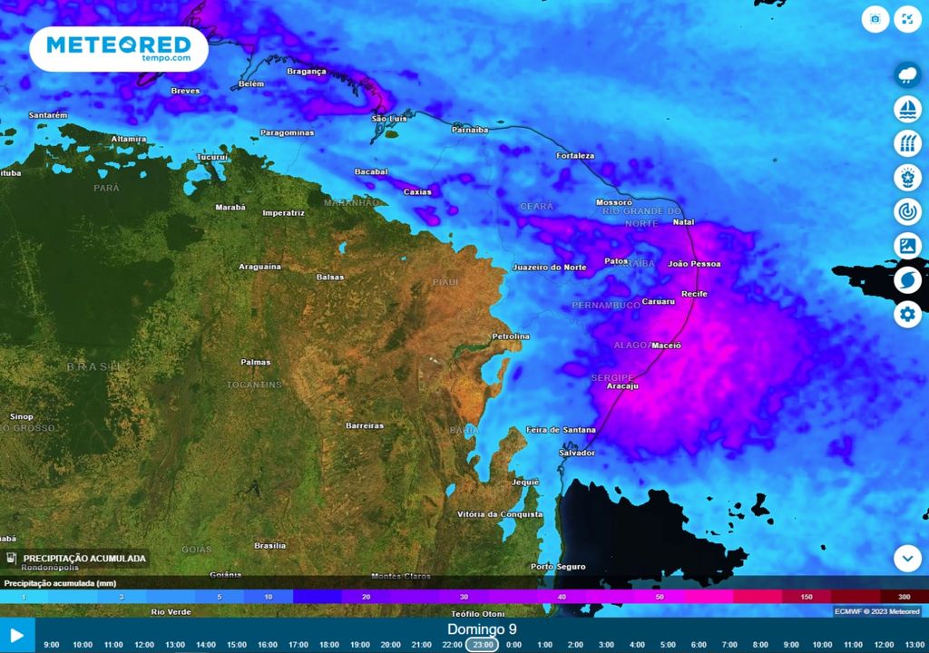 Esse escoamento de umidade vindo do oceano tem sido o principal causador das chuvas na região nos últimos dias e deverá continuar nos próximos dias. Esse escoamento ainda ganhará o reforço de um cavado invertido nos baixos níveis da atmosfera. Essa combinação resultará em chuvas mais volumosas entre os estados de Sergipe, Alagoas, Pernambuco e Paraíba que poderão superar os 50 mm até domingo (09), de acordo com as previsões do modelo ECMWF.