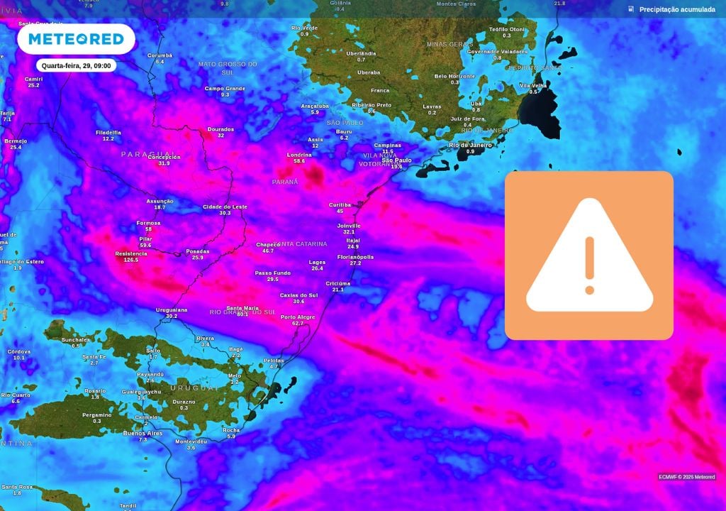 Os maiores acumulados previstos pela rodada atual do modelo de confiança da Meteored, o ECMWF, podem se aproximar de 200 mm sobre o Paraná e ultrapassar 100 mm no Rio Grande do Sul e em Mato Grosso do Sul.