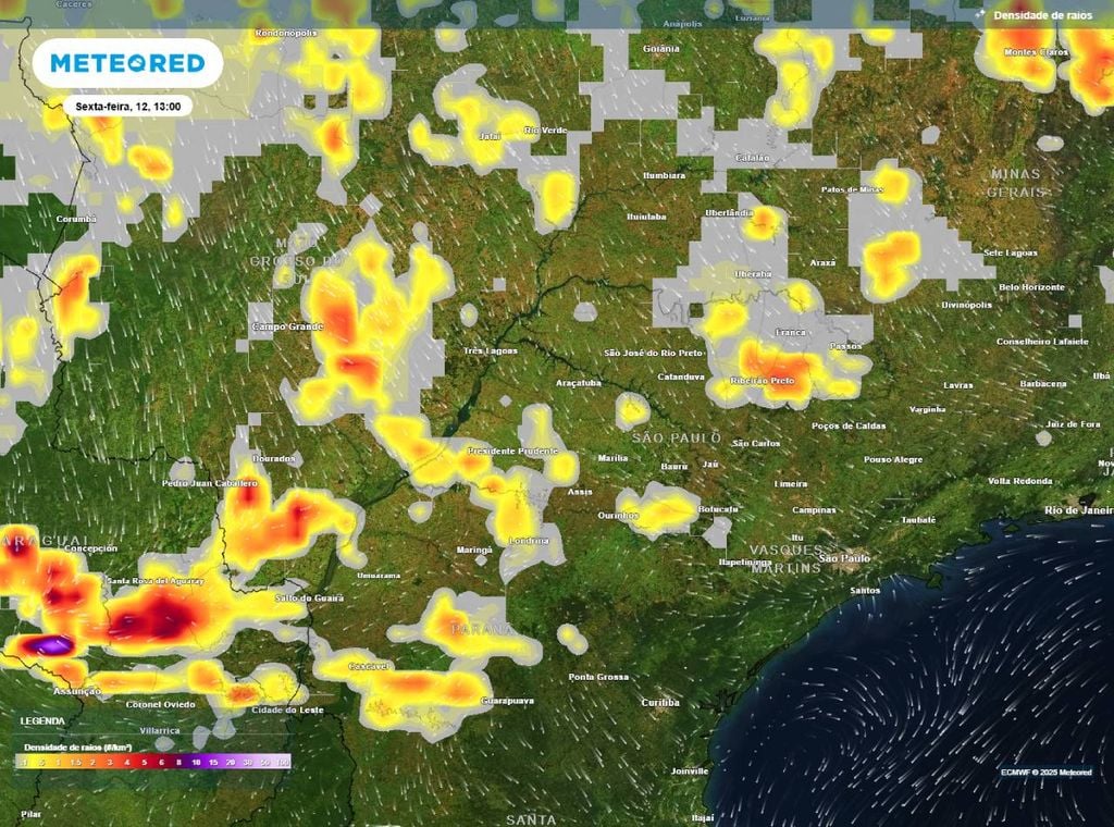 Contudo, o destaque depois disso é para um rio atmosférico que se estabelece na faixa central do Brasil entre a sexta-feira (12) e o sábado (13), reforçando as condições para chuvas intensas e tempestades nos estados do Mato Grosso do Sul, Paraná e São Paulo.