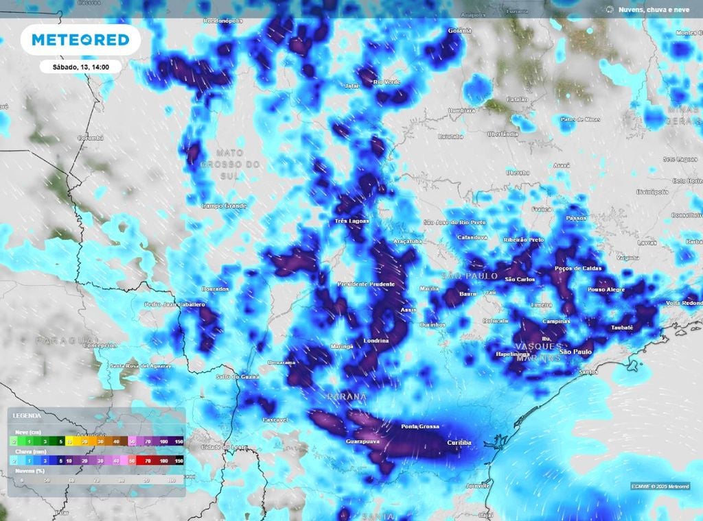 Na manhã do sábado (13) já começa com chuvas intensas em todo o Paraná, que podem ocorrer em forma de pancadas e com trovoadas especialmente no oeste do estado. No Mato Grosso do Sul, as chuvas serão mais intensas e com tempestades em áreas do norte e do sul do estado. Em São Paulo, neste período são esperadas chuvas mais fracas em todo o estado.