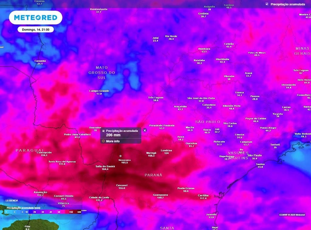 São esperados volumes de chuva entre 100 mm e 150 mm no centro-sul do Mato Grosso do Sul, contudo, o destaque fica para o Paraná. Serão registrados acumulados acima dos 120 mm em grande parte do estado paranaense, e chegando em torno dos 200 mm na faixa oeste do estado.