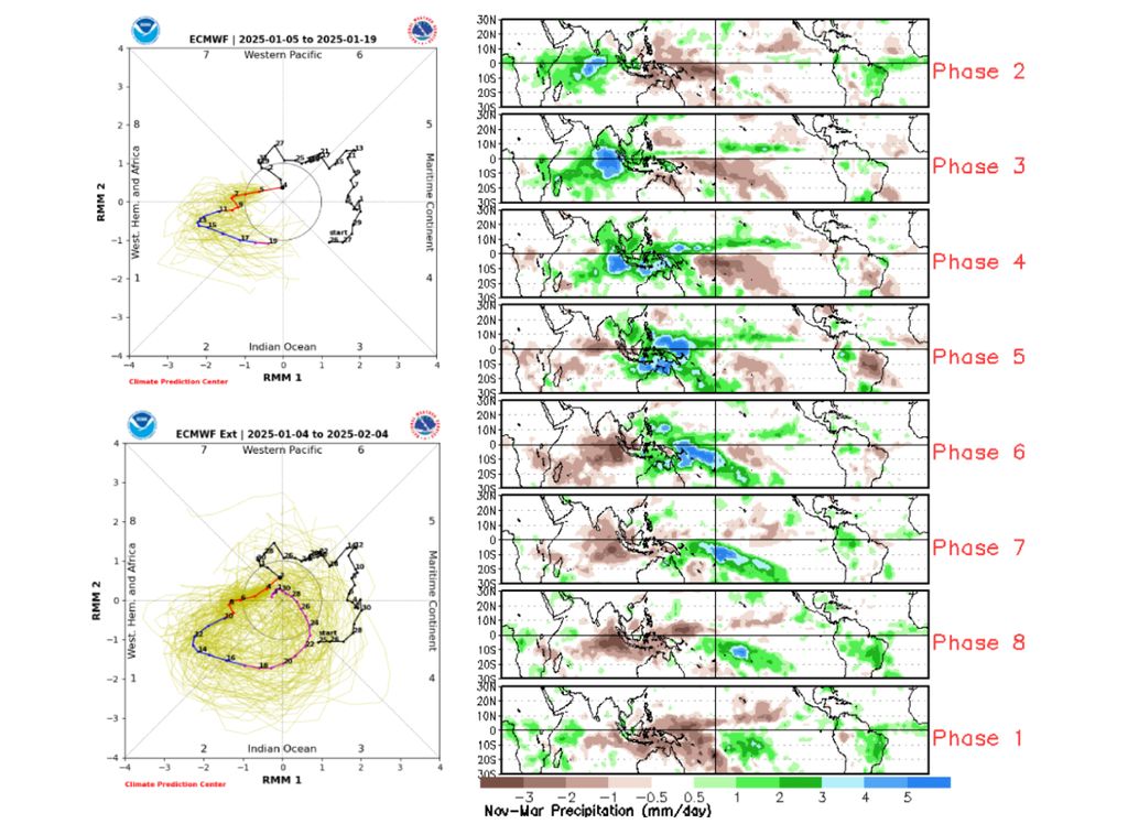 Ao final desta semana o Brasil irá se encontrar sobre a atuação da fase 1 do fenômeno, caracterizada por aumentar as chuvas principalmente sobre as região Norte e Nordeste do país. De acordo com o modelo ECMWF, a fase 1 permanecerá ativa até meados de janeiro, entre os dias 16 e 17.