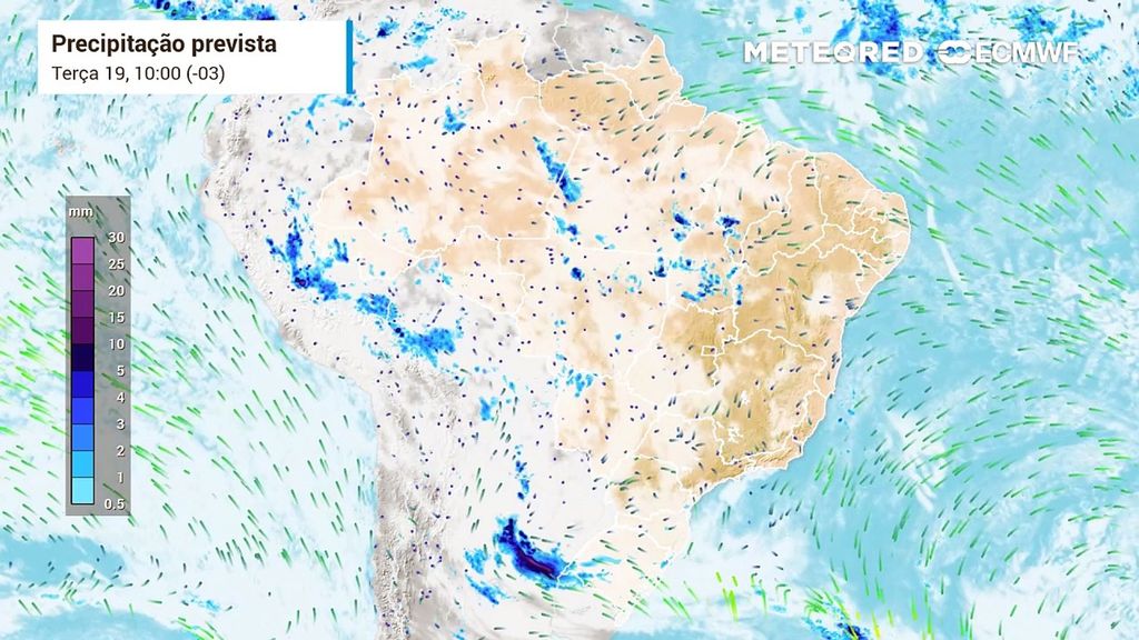 Ao todo, as regiões mais afetadas serão os litorais do Sul (inclusive as capitais Florianópolis e Porto Alegre) e alguns pontos isolados de Minas Gerais e do Espírito Santo, onde os acumulados podem ultrapassar os 100 mm de chuva até sexta.