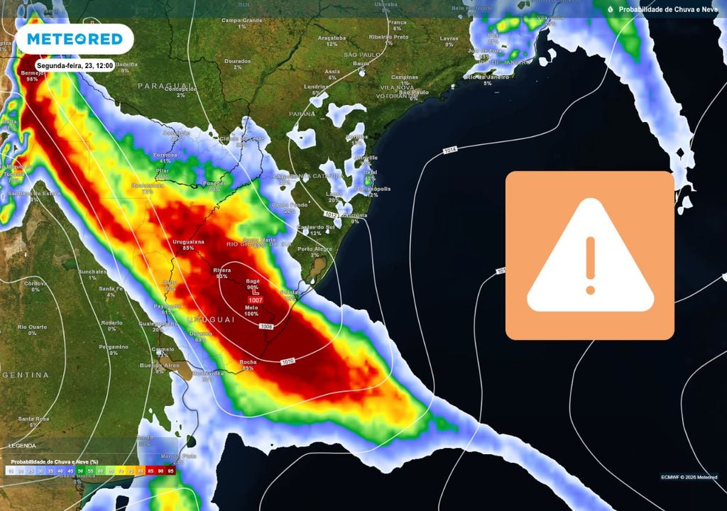 Embora, a princípio, os maiores volumes estejam sendo previstos sobre o Uruguai, alguns pontos do Rio Grande do Sul também podem ter volumes considerados incomuns, que podem se aproximar de 100 mm em 24 horas.