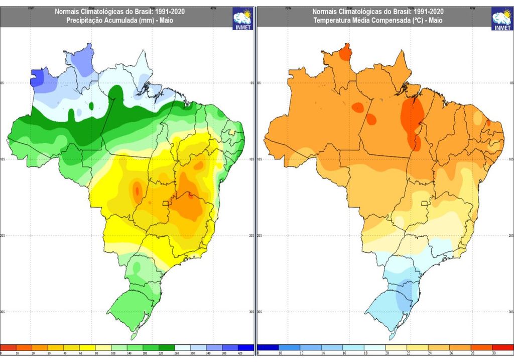Climatologicamente maio é um mês de temperaturas bem mais amenas, por já apresentar características de inverno, com menor radiação incidente nas latitudes mais ao sul do Brasil e maior frequência e intensidade de massas de ar frio. Em relação às chuvas, geralmente os maiores acumulados ficam concentrados no extremo norte do país, entre os estados de Roraima, Amapá, extremo norte do Amazonas e Pará.