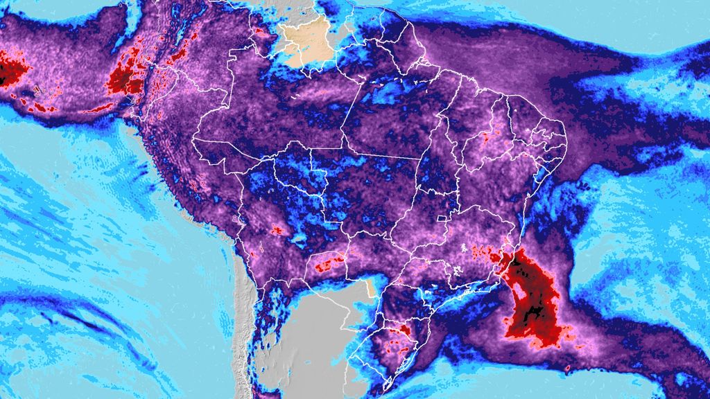 Acontece que a circulação atmosférica, organizada em parte pelo ciclone subtropical que está se formando no Oceano Atlântico, é bastante propícia ao transporte de umidade do oceano para a região Sul, alimentando a formação de chuvas na região.