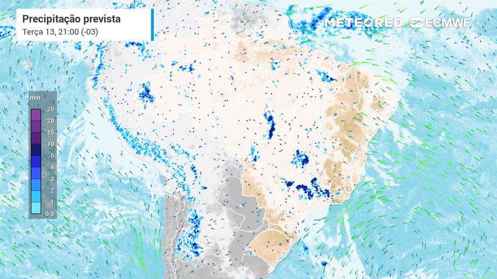 Na terça-feira (13), há previsão de chuvas pontuais pela manhã entre o Sul, Sudeste e o Centro-Oeste e entre as regiões Norte e Nordeste, mas sem potencial de provocarem transtornos.