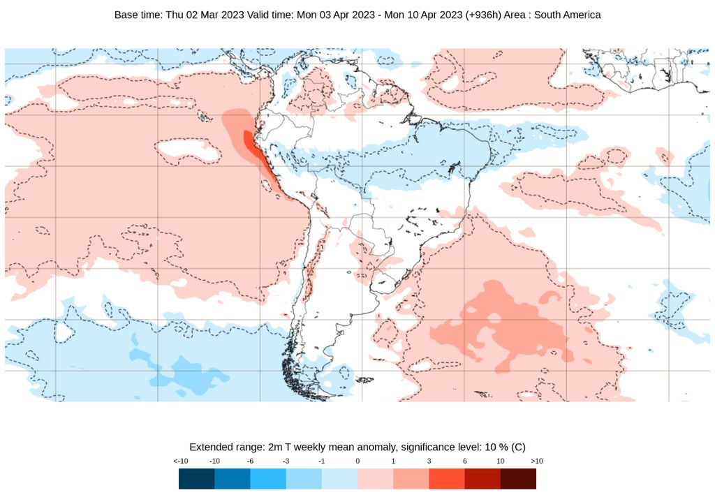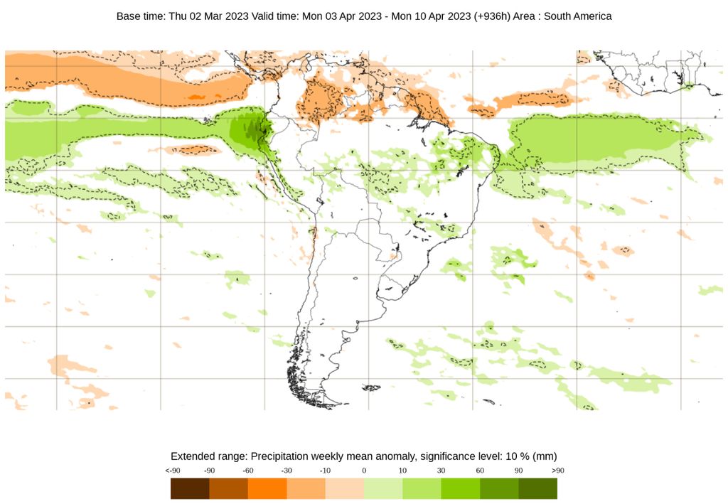 A última atualização do modelo ECMWF mostra anomalias de precipitação positivas no centro-norte do Brasil, sendo mais intensas na Região Nordeste, muito provavelmente devido a influência da ZCIT. Já o sinal que aparece no Sudeste e no Centro-Oeste pode ser em virtude da Alta da Bolívia e da atuação de uma frente fria. Na Região Sul, a neutralidade pode ser interpretada por um período de pouca chuva, com maior chance de dias de tempo firme.