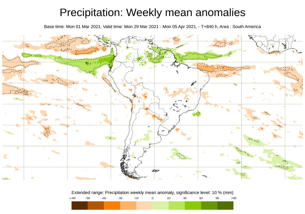O mapa de anomalia do modelos ECMWF para o período entre 29 de março e 05 de abril, não traz anomalias marcantes para boa parte do país. No entanto, é possível especular sobre a existência de alguns sistemas atuantes e um cenário mais provável.