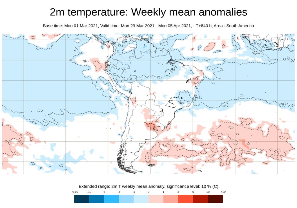 Quanto à distribuição das anomalias de temperatura, além de passar uma ideia de sensação térmica, ajudam a complementar a condição mais provável de tempo para a Semana Santa.