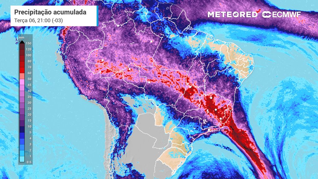 Na terça-feira (6), o padrão de ZCAS se mantém, com redução da intensidade das chuvas, mas trazendo os mesmo riscos para as mesmas áreas da segunda-feira (5). A diferença é que as chuvas aumentam no oeste de Minas Gerais e no norte de São Paulo, com redução da chance no leste paulistana no Rio de Janeiro.