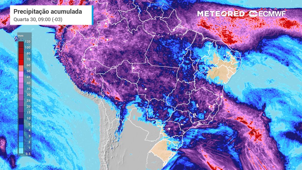 Na quarta-feira (30), a frente fria se mantém sobre a região de Porto Seguro, onde o tempo fica nublado e com chuva ao longo de todo o dia, o que pode resultar em alagamentos e inundações. Na região de Salvador, a nebulosidade aumenta, mas ainda não há previsão de chuva.
