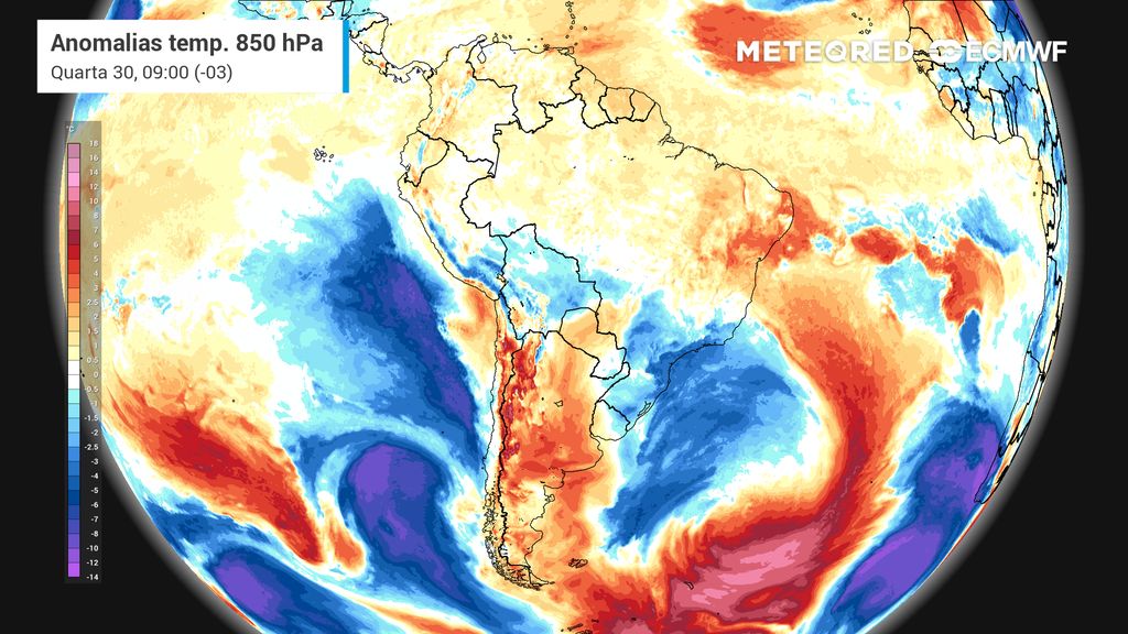 Enquanto isso, a massa de ar frio vai baixando mais as temperaturas na Região Sul, no Mato Grosso do Sul e também nos estados de São Paulo e do Rio de Janeiro. A sensação de frio é mais sentida ainda no Rio Grande do Sul e em Santa Catarina.