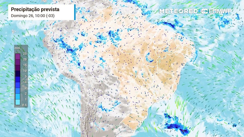Na Região Norte e interior do Nordeste, há potencial de pancadas isoladas e de tempestades muito pontuais. Chuvas mais intensas estão previstas somente para o estado do Tocantins.